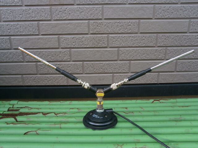 RHM8(BNC)を入手したことから、いつも使用しているRHM10と組み合わせて、短縮DPアンテナとして使用できないか試してみました。給電部は手元にあったY型コネクタを使用しました。当初、マグネット基台を使用して車のボンネットに取付けてみましたが、SWRが高く使用できなかったため、マグネット基台を踏み台に置いてアースを取らない状態で実験しました。両方のアンテナの長さを同時に調整しながらSWRの最良点を探します。結構手間がかかりましたが、7/10MではSWRも下がり運用可能範囲になりました。受信した限りでは単体での使用よりSが2程度上がり、ノイズレベルも低くノイズに埋もれた信号も受信できることが分かりました。フルサイズのツエップアンテナと比較すれば相当ゲインは落ちますが、単体での使用よりストレスなく運用できると思います。今回は、本格的な運用ではなく実験ですが、設置金具を作成すれば本格的な移動アンテナとして使用できそうでした。なお、14M以上は何も聞こえなかったため実験結果は夏場に。